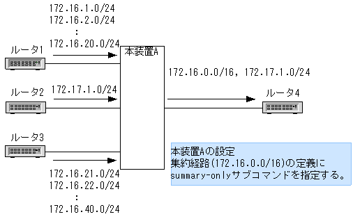 集約元経路の広告抑止は集約経路単位または全集約経路に対して指定できます。集約経路単位に指定する場合は,コンフィグレーションコマンドaggregateのsummary-onlyサブコマンドで指定します。全集約経路を対象とする場合はコンフィグレーションコマンドoptionsのsummary-onlyパラメータで指定します。