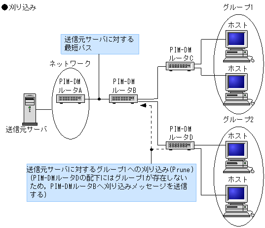 マルチキャスト配送ツリーの刈り込み動作を次の図に示します。