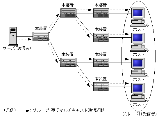 マルチキャストはサーバ(送信者)から各グループ(受信者)にデータを配信する1(送信者):N(受信者)の片方向通信に適します。IPv4マルチキャストの適応ネットワーク構成,注意事項を次に示します。