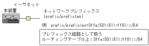 ポイント−ポイント型回線のダイレクト経路(グローバルアドレスおよび手動設定のリンクローカルアドレス)はホスト経路として生成されます。したがって,ポイント−ポイント型回線のダイレクト経路は二つのホスト経路として広告されます。本装置では,コンフィグレーションコマンドoptionsのgen-prefix-routeパラメータを指定することによって,ポイント−ポイント型回線のダイレクト経路を一つのネットワーク経路として広告できます。なお,このパラメータを指定した場合は,該当するダイレクト経路のホスト経路は広告対象外となります。