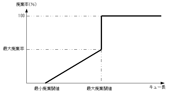 - 最小廃棄閾値を超え始めたとき,送信パケットの中からいくつかのパケットを最大廃棄率に応じて廃棄します。