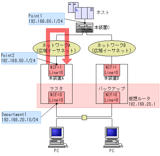 「図6-5 VRRPポーリング」の,本装置Aの仮想ルータの障害監視インタフェースをPoint2,障害監視インタフェースダウン時の優先度を0,ポーリングの宛先IPアドレスをルータ1のPoint1のIPアドレス(192.168.80.1)に設定した場合,ネットワーク上で障害が発生し応答が返らなくなると,自動的にマスタが本装置Aから本装置Bへ切り替わります。なお,障害検出時間または障害回復検出時間はコンフィグレーションによって変更できます。