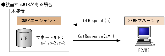 装置が該当するMIBを保持している場合,GetResponseオペレーションでMIB情報を応答します。該当するMIBを保持していない場合は,GetResponseオペレーションでnoSuchNameを応答します。GetRequestオペレーションを次の図に示します。