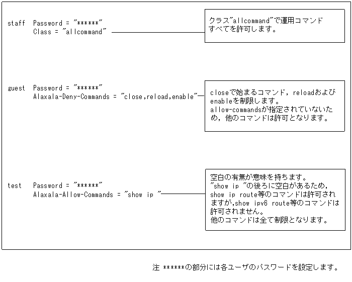 (例:ALAXALA-Allow-Commands ="show ,ping ,telnet ")ALAXALA-Deny-Commands
