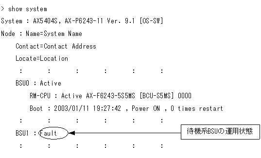 > reload dump-image -f standby [Enter]- 待機系BCU再起動後,待機系BCUの運用状態が「Standby」になっていることを確認してください。待機系BCUの運用状態の確認方法は,運用系BCUに接続した運用端末から,次に示すshow systemコマンドを実行してください。show systemコマンドの実行結果は,「図9-26 show systemコマンド実行結果」を参照してください。