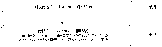 - 一重化で運用していた装置に待機系BCUおよびBSUを取り付けただけでは,待機系BCUおよびBSUは運用状態(正常な二重化運用)になりません。(手順1)終了後,運用系BCUに接続した運用端末から,次に示す待機系BCUを運用状態にするfree standbyコマンドの実行が必要です。また,コマンドを実行する代わりに待機系BCUのclose/freeボタンを押下することにより,同様の状態になります。