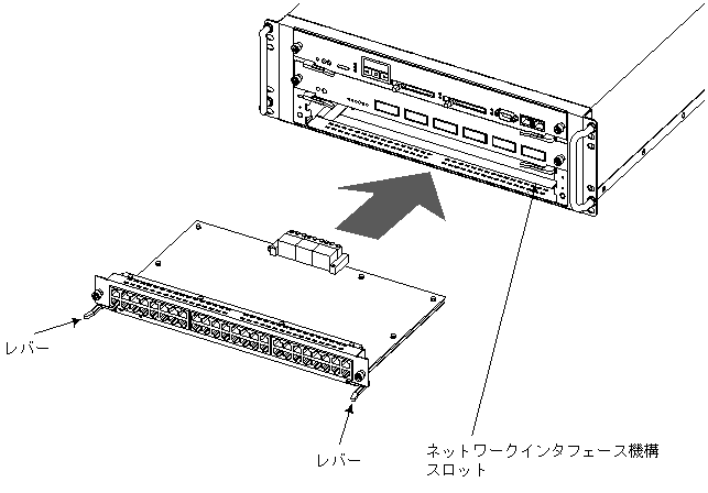 - レバーを図のように開き,ネットワークインタフェース機構スロットにネットワークインタフェース機構を挿入します。