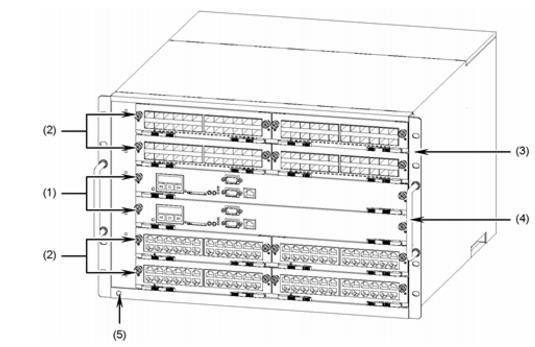 図1-7 正面外観(1) 制御スイッチング機構(CSU)スロット(2) ネットワークインタフェース機構(NIF)スロット(3) ラック取り付け金具(4) 取っ手(5) リストストラップ用端子
