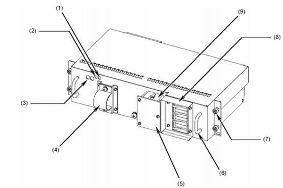 図1-10 外観(1) ALARM LED(2) POWER LED(3) 電圧測定端子(4) ケーブルクランプ(5) 端子盤のカバー(6) 取っ手(7) 取り付けネジ(8) ブレーカ(9) 端子盤