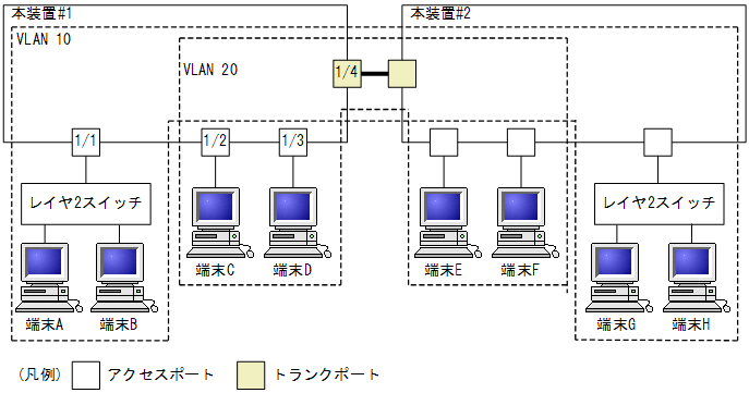 ポートVLANを設定する手順を以下に示します。ここでは,次の図に示す本装置#1の設定例を示します。