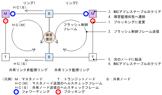 リング障害を検出している状態で,自身が送信したHC(M)を受信すると,リング障害が復旧したと判断し,シングルリング時と同様に,次に示す手順で復旧動作を行います。