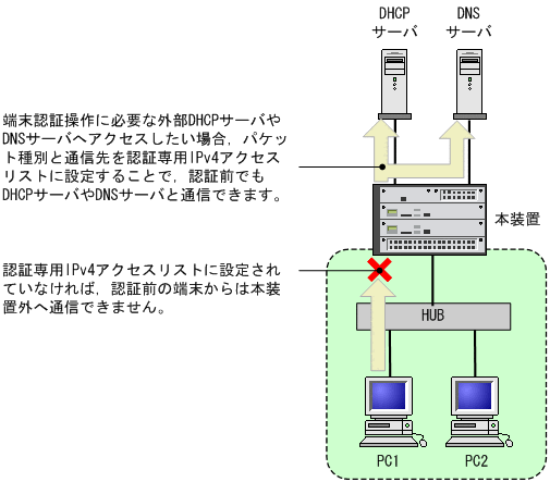 認証前状態の端末が本装置外の装置(DHCPサーバやDNSサーバ)と通信できるようにするには,認証専用のIPv4アクセスリスト(以降,認証専用IPv4アクセスリストと呼びます)を設定します。