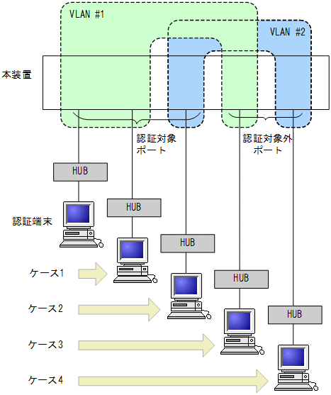 - −:VLAN単位認証(動的)はVLAN単位での設定のため,同一VLANに認証対象外ポートはありません