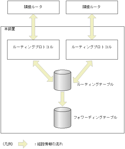 ルーティングプロトコルは,隣接ルータと経路情報を交換します。各ルーティングプロトコルで学習した経路情報はルーティングテーブルで保持されます。そして,宛先として最適な経路情報をフォワーディングテーブルに登録します。パケットはフォワーディングテーブルに従って中継されます。 図7-1 ルーティングの概要