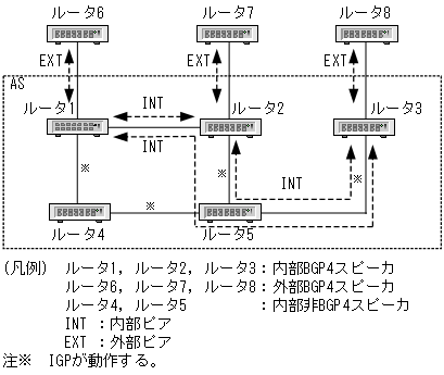 - 内部ピアで非BGPスピーカを経由して経路情報を通知する(例えば,ルータ2からルータ3に通知する)場合,非BGPスピーカでIGP経由でその経路情報を学習していなければなりません。これは該当する経路情報の通知によって通知先BGPスピーカから入ってくる該当宛先へのIPパケットが,該当する経路を学習していない非BGPスピーカのルータで廃棄されるのを防ぐためです。例えば,「図12-1 内部ピアと外部ピア」ではルータ3からルータ5に入ってくるIPパケットがルータ5で廃棄されるのを防ぐためです。