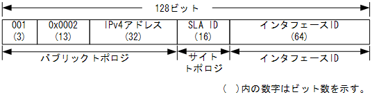 6to4トンネルで使用するアドレス形式です。6to4トンネル用として,IANA(Internet Assigned Numbers Authority)からIPv6グローバルアドレスにおける集約子の一つであるTLA IDには0x0002が割り当てられています。また,NLA IDには6to4トンネルを使用するサイトが持つグローバル・ユニキャスト・IPv4アドレスが定義されます。