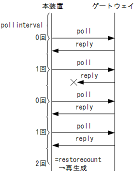 スタティック経路の動的監視によって削除された経路のゲートウェイへのpollinterval周期のポーリングに対し,restorecount回数連続して応答があった場合に経路を再生成します。restorecount =2の場合は,ポーリングに対して2回連続して応答があれば経路を再生成します。スタティック経路の動的監視による経路再生成の例を次の図に示します。