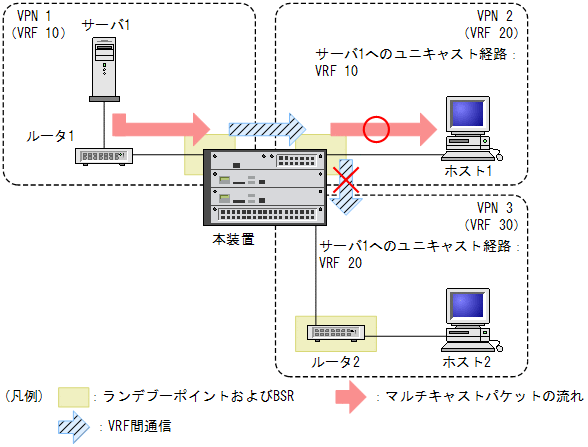 次の図に示すようにVPN 3からVPN 1へのユニキャスト経路がVPN 2を経由して形成されていた場合,VPN 1上のサーバ1が送信するIPv6マルチキャストパケットをVPN 2上のホスト1は受信できますが,VPN 3のホスト2は受信できません。