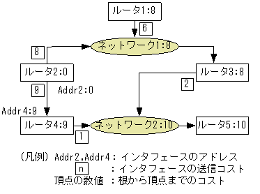 この図のネットワーク上でOSPFv3を使用した場合のトポロジとコストの設定例を次の図に示します。