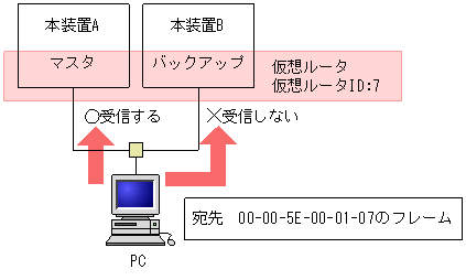 VRRPでは仮想MACアドレス宛てフレームが切り替えの対象になります。マスタとバックアップが切り替わった後で通信を継続できるのは仮想MACアドレス宛てフレームに限定されます。「図4-1 仮想MACアドレス宛てフレームの受信」の場合,PCは仮想MACアドレスを宛先としてフレームの送信を行わなければなりません。