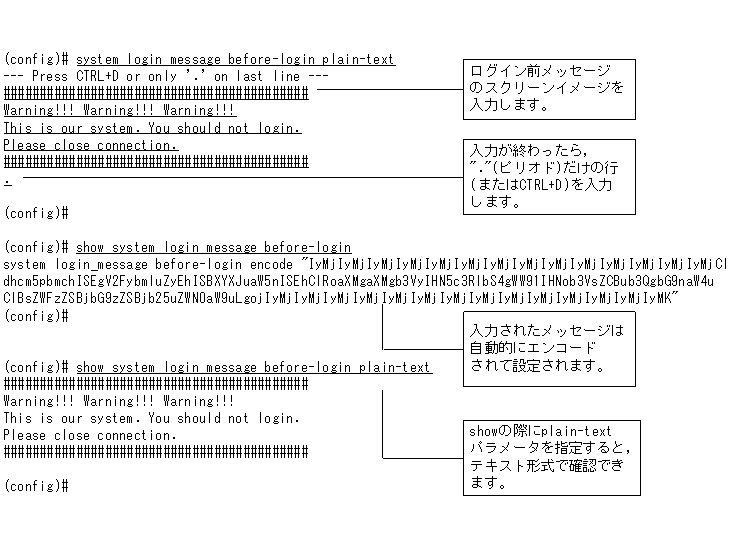- ログインメッセージを入力する際には,クライアントの画面設定を確認し,表示できない文字を入力しないでください。show system login_message [before-login | after-login | before-login-ftp | after-login-ftp] plain-text実行時や,クライアント接続時に画面やプロンプトの表示が崩れ,操作できなくなる恐れがあります。