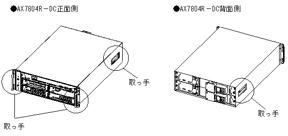 AX7804R−DC本体の質量は「表2-1 機器の設置条件」の通りです。設置および運搬作業は3人以上で行なってください。また,移動させる場合は必ず図の○で示す取っ手を使用してください。(取っ手は本体の左右にあります。)