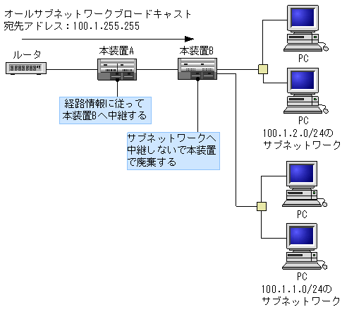 例えば,100.1.0.0/16のネットワークをサブネットワーク化して,100.1.1.0/24と100.1.2.0/24の二つのサブネットワークに分割して使用している場合に,100.1.255.255を宛先とするオールサブネットワークブロードキャストのIPパケットが送信された場合,100.1.1.0/24と100.1.2.0/24のサブネットワークを直接接続する本装置までは該当パケットが届きますが,本装置配下の100.1.1.0/24と100.1.2.0/24のサブネットワークへは中継しないで本装置で該当パケットを廃棄します。オールサブネットワークブロードキャストを次の図に示します。