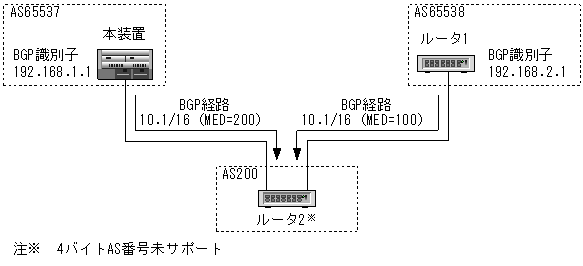 この例では,AS65537にある本装置とAS65538にあるルータ1は,AS200にあるルータ2へMED属性値が付けられた同一宛先の経路を広告しています。ルータ2では4バイトAS番号をサポートしていないため,本装置とルータ1は同一AS(AS_TRANS)であると判断し,MED属性値によって経路を選択する場合があります。この結果,本来BGP識別子の小さい本装置から学習した経路を選択するところ,MED属性値の小さいルータ1から学習した経路を選択してしまうおそれがあります。