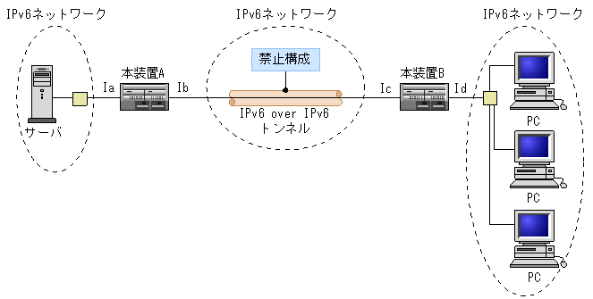 - 本装置AのIPv6インタフェースIbと本装置BのIPv6インタフェースIcをトンネルの仮想インタフェースでカプセル化されたパケットの送受信インタフェースとして指定します。次に,トンネル仮想インタフェースのアドレス設定でIPv6アドレスを設定すると,パケット送受信インタフェースと同じプロトコルを指定したIPv6 over IPv6トンネル構成となるため,パケットが正常に中継されません。