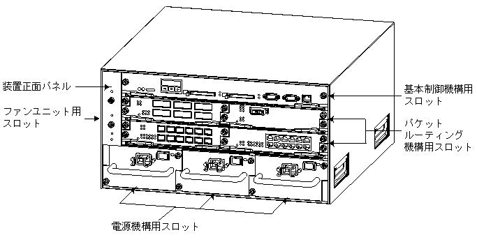 - 標準ポートのネットワークインタフェース機構およびPRU分離型高密度ポートのネットワークインタフェース機構はパケットルーティング機構に搭載して使用します。また,PRU内蔵型高密度ポートのネットワークインタフェース機構は本装置のパケットルーティング機構用スロットに搭載して使用します。パケットルーティング機構については「1.5 パケットルーティング機構(PRU)」を,ネットワークインタフェース機構については「1.6 ネットワークインタフェース機構(NIF)」を参照してください。