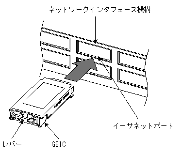 【ステップ1】 レバーを起こし,しっかりと奥までGBICを挿入します。 図4-68 モジュールAタイプの挿入 【ステップ2】 レバーを矢印の方向に下げてロックします。 図4-69 モジュールAタイプのロック