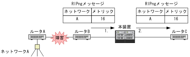 - 本装置はルータAとルータB間の障害を検出すると,ルータBからメトリック16(到達不可)のネットワークAの経路情報を受信して,ルーティングテーブルからネットワークAの経路情報を削除します。