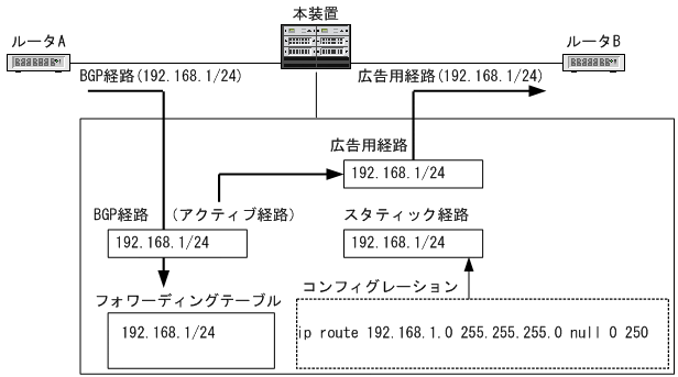 広告用経路生成とは,BGP4経路またはBGP4+経路と同じ宛先の経路情報を自装置内のアクティブ経路から生成して,BGP4またはBGP4+で広告する機能です。パケットのフォワーディングには実際のBGP経路を使用して,他装置への広告には生成した広告用経路を使用することによって,BGP経路を宛先とするフォワーディングと安定した経路広告ができます。この機能の使用例を次に示します。