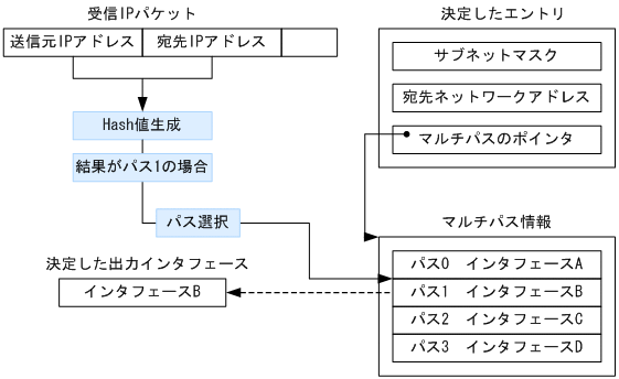 ルーティングテーブルの検索で,宛先IPアドレスに該当するエントリが決定すると,次に出力インタフェースを決定します。出力インタフェースは,受信したIPパケットの送信元IPアドレス(Source IP Address)と宛先IPアドレス(Destination IP Address)からHash値を生成して,それによってマルチパスの候補の一つを選択して決定します。出力インタフェースの決定を次の図に示します。