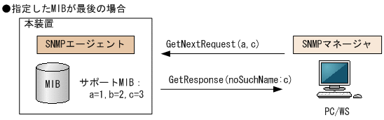 SNMPv2Cの場合,指定したMIBが最後の場合はGetResponseでMIB値にendOfMibViewを応答します。SNMPv2Cの場合のGetNextRequestオペレーションを次の図に示します。