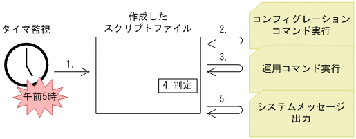 事前に,午前5時に発生するタイマ監視イベントと,イベント発生時に起動するスクリプトファイルを,コンフィグレーションで登録しておきます。