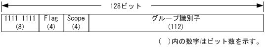 マルチキャストアドレスは複数のノードの集合体を示すアドレスです。アドレスフォーマットプレフィックスの上位8ビットがffであるアドレスが定義されています。ノードは複数のマルチキャストグループに所属できます。マルチキャストアドレスは,パケットの始点アドレスとして使用できません。マルチキャストアドレスには,アドレスフォーマットプレフィックスに続いて,フラグフィールド(4ビット),スコープフィールド(4ビット)およびグループ識別子フィールド(112ビット)が含まれます。IPv6マルチキャストアドレスを次の図に示します。