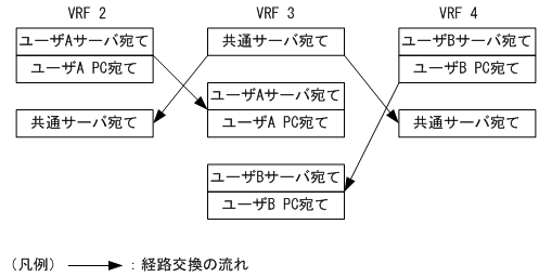 - ユーザA(VRF 2)と共通サーバ(VRF 3),およびユーザB(VRF 4)と共通サーバ(VRF 3)はそれぞれ経路交換しているため通信できます。