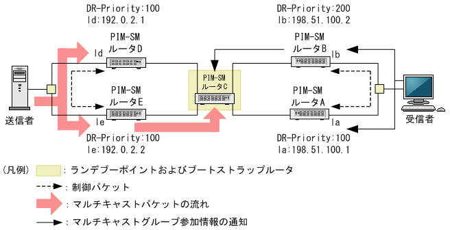 PIM-SMルータAとPIM-SMルータBのDR-Priorityを比較した場合,PIM-SMルータBのDR-Priorityが大きいため,PIM-SMルータBがDRとなってランデブーポイントにマルチキャストグループ参加情報を通知します。PIM-SMルータDとPIM-SMルータEのDR-Priorityを比較した場合,DR-Priorityが等しいため,IPv4アドレスで比較します。その結果,IPv4アドレスが大きいPIM-SMルータEがDRとなってランデブーポイントに対してIPカプセル化パケットを中継します。