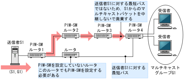 同一LAN上に複数のPIM-SMルータを接続している場合,そのネットワークにマルチキャストパケットが重複して中継される可能性があります。