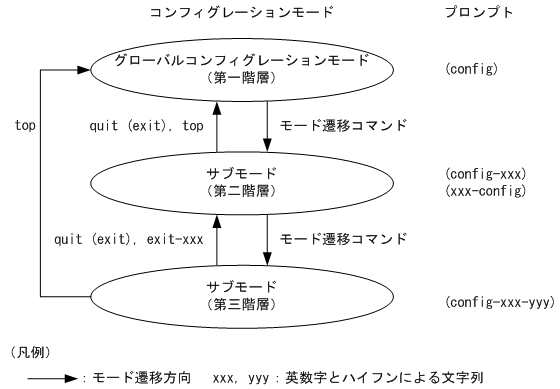 コンフィグレーションは,実行できるコンフィグレーションモードで編集します。サブモードのコンフィグレーションを編集する場合は,グローバルコンフィグレーションモードでサブモードに移行するためのコマンドを実行してモードを移行した上で,コンフィグレーションコマンドを実行する必要があります。コンフィグレーション入力時のモード遷移の概要を次の図に示します。