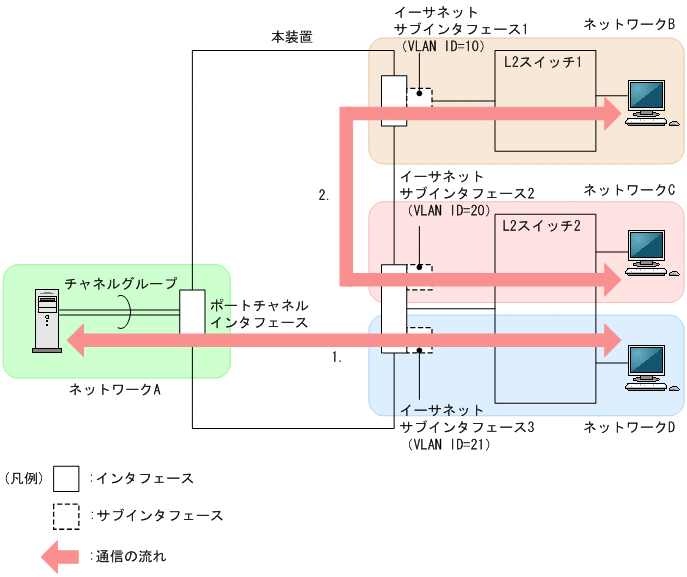 - ネットワークAとネットワークD間のレイヤ3中継(異なるサブネット間中継)