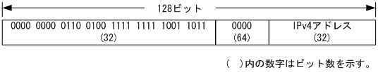 ウェルノウン・プレフィックス(64:ff9b::/96)を使用する形式では,下位32ビットにIPv4アドレスが格納されます。ウェルノウン・プレフィックスを使用したIPv4埋め込みIPv6アドレスを次の図に示します。
