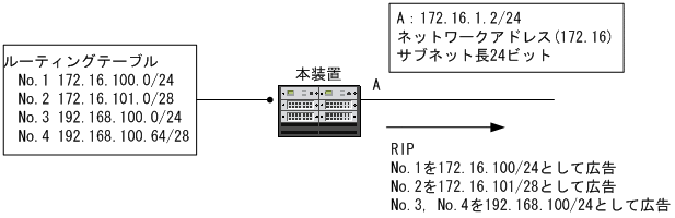 RIPではコンフィグレーションコマンドauto-summaryを設定することで,隣接装置に対して広告する複数のサブネット経路情報を,自動的に一つのナチュラルマスク経路情報として集約して広告できます。このコンフィグレーションコマンドはRIP-1,RIP-2共に有効となります。