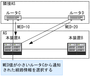 MED属性は,同一の隣接ASから学習した,ある宛先への複数のBGP経路の優先度を決定する属性です。より小さいMED属性値を持つ経路情報が優先されます。コンフィグレーションコマンドbgp always-compare-medを設定して,異なる隣接ASから学習したBGP経路間の優先度選択に使用できます。