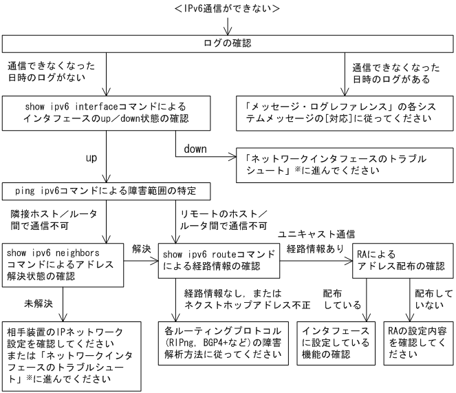 ここでは,3.に示すように「コンフィグレーションおよびネットワーク構成は正しいのにIPv6通信ができない」,「これまで正常に動いていたのにIPv6通信ができなくなった」というケースを中心に,障害部位および原因の切り分け手順を説明します。