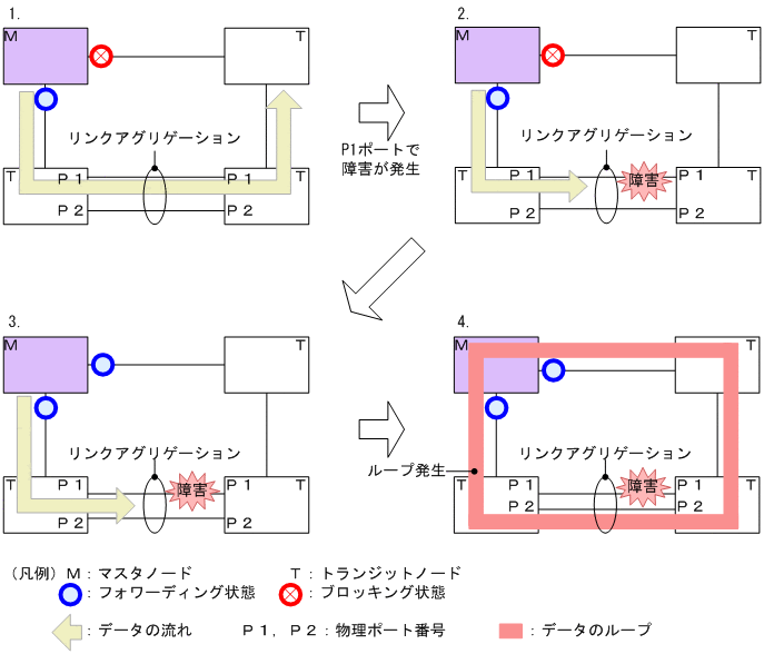 リンクアグリゲーションの縮退動作が完了して,P2を経由して通信することでループが発生します。