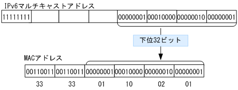 IPv6マルチキャストパケットの宛先MACアドレスはIPv6アドレスの下位32ビットをMACアドレスにコピーして生成します。IPv6マルチキャストアドレスは,マルチキャストグループを識別するグループIDフィールドが112ビット長のフォーマットと,32ビット長のフォーマットの2種類が規定されています。グループIDフィールドが112ビット長のアドレスフォーマットを使用する場合は,IPv4マルチキャストアドレスと同様にMACアドレスの重複が発生します。IPv6マルチキャストアドレスとMACアドレスの対応を次の図に示します。