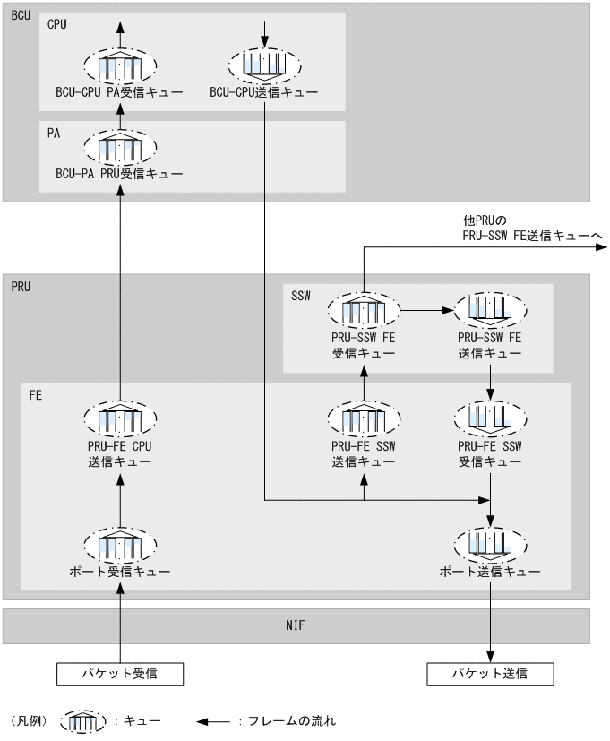 AX8616RおよびAX8632RでPE-NIFを使用した場合の,装置内キューとBCU-CPUを経由しないフレームの流れを次に示します。