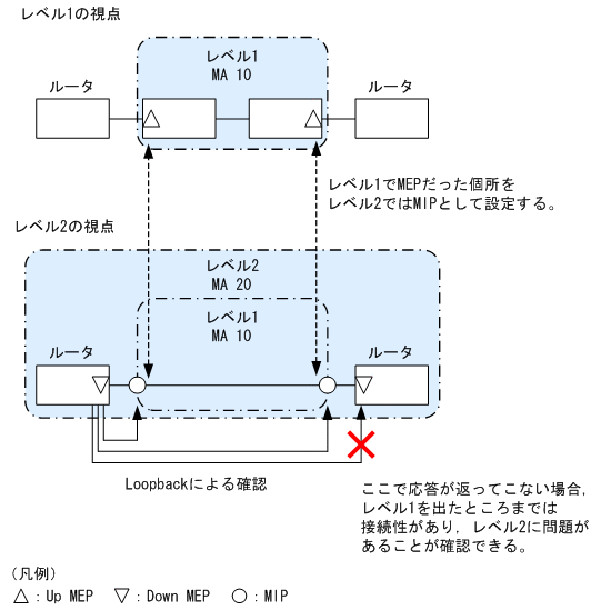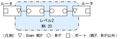 レベル2を設計する際,レベル1のMAでMEPに設定しているポートをレベル2のMIPとして設定します。これによって,レベル2ではレベル1の範囲を認識しながらも,運用上は意識しない状態で管理できます。